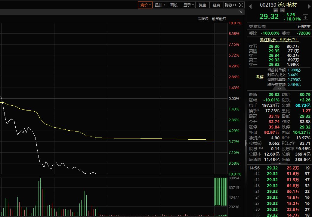 东方财富行情数据显示,在 28 日下午 13 时开盘后,沃尔核材股价在没有任何征兆的情况下 「跳水」,并伴随着成交量的明显放大,并最终在 13:54「封死」 跌停。截至收盘,沃尔核材仍有 1.99 亿元的封单额,并在 「跌停板」 上成交了 5.484 亿元,全天成交 60.72 亿元,换手率 17.23%。