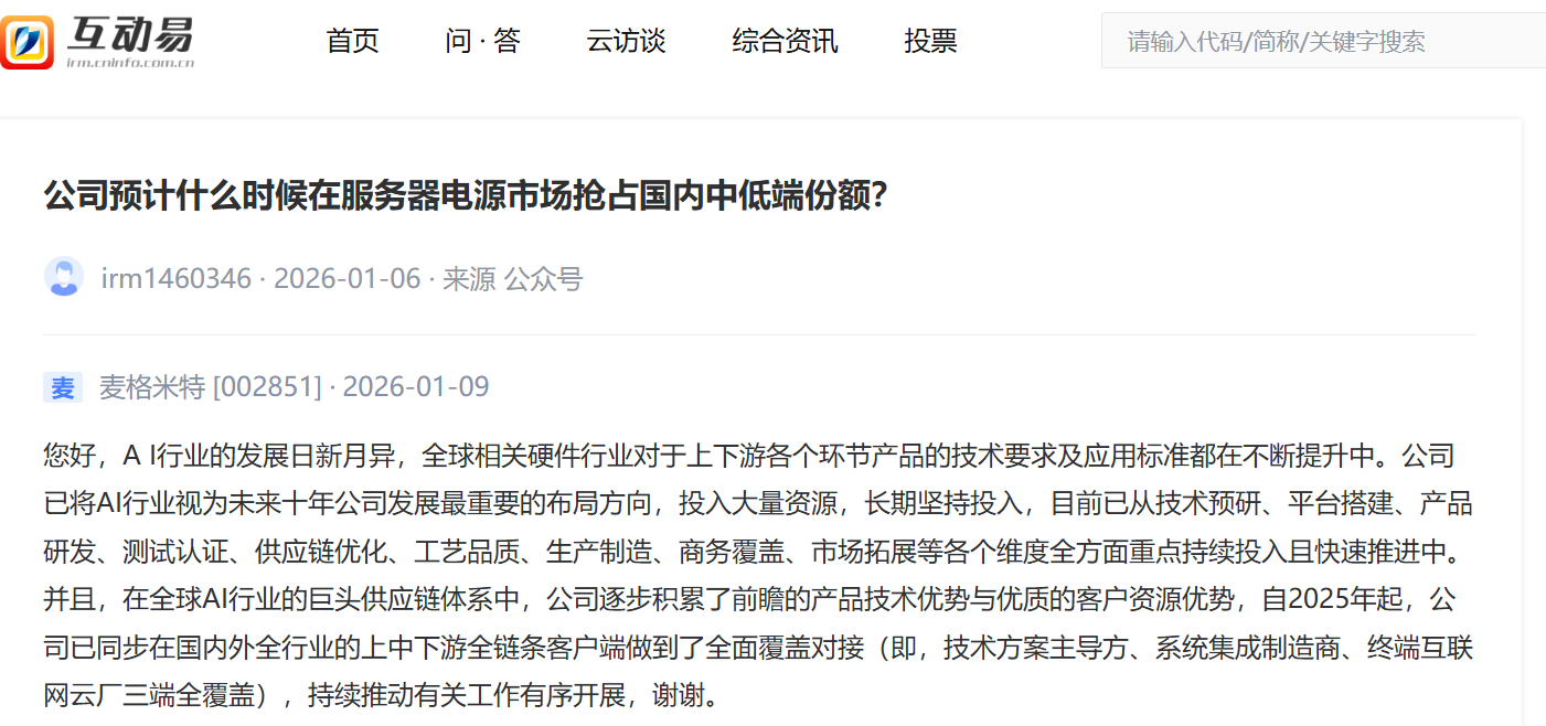 「互动易」 平台显示,2026 年 1 月 9 日,针对有投资者 「公司预计什么时候在服务器电源市场抢占国内中低端份额?」 的提问,麦格米特回应称,AI 行业的发展日新月异,全球相关硬件行业对于上下游各个环节产品的技术要求及应用标准都在不断提升中。公司已将 AI 行业视为未来十年公司发展最重要的布局方向,投入大量资源,长期坚持投入,目前已从技术预研、平台搭建、产品研发、测试认证、供应链优化、工艺品质、生产制造、商务覆盖、市场拓展等各个维度全方面重点持续投入且快速推进中。并且,在全球 AI 行业的巨头供应链体系中,公司逐步积累了前瞻的产品技术优势与优质的客户资源优势,自 2025 年起,公司已同步在国内外全行业的上中下游全链条客户端做到了全面覆盖对接 (即,技术方案主导方、系统集成制造商、终端互联网云厂三端全覆盖),持续推动有关工作有序开展。