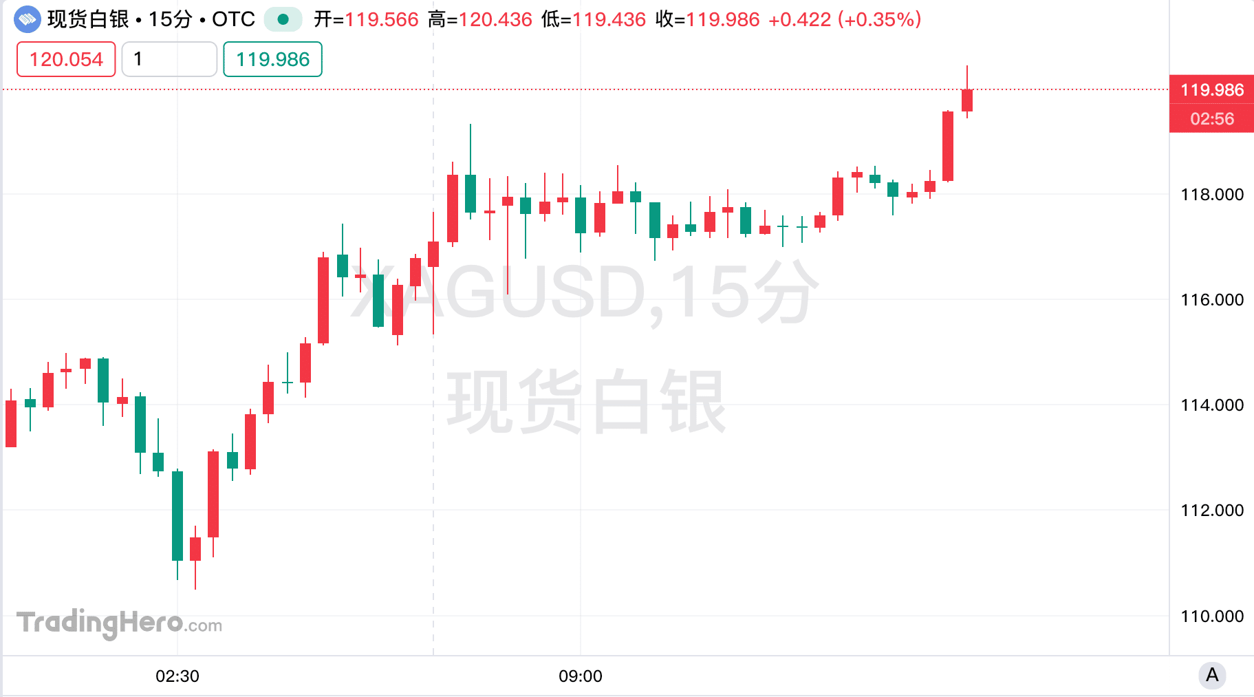 周四,现货白银首次站上 120 美元/盎司,再创新高;纽约期银站上 120 美元/盎司,日内涨 5.73%。沪银主力合约日内暴涨 10.00%。