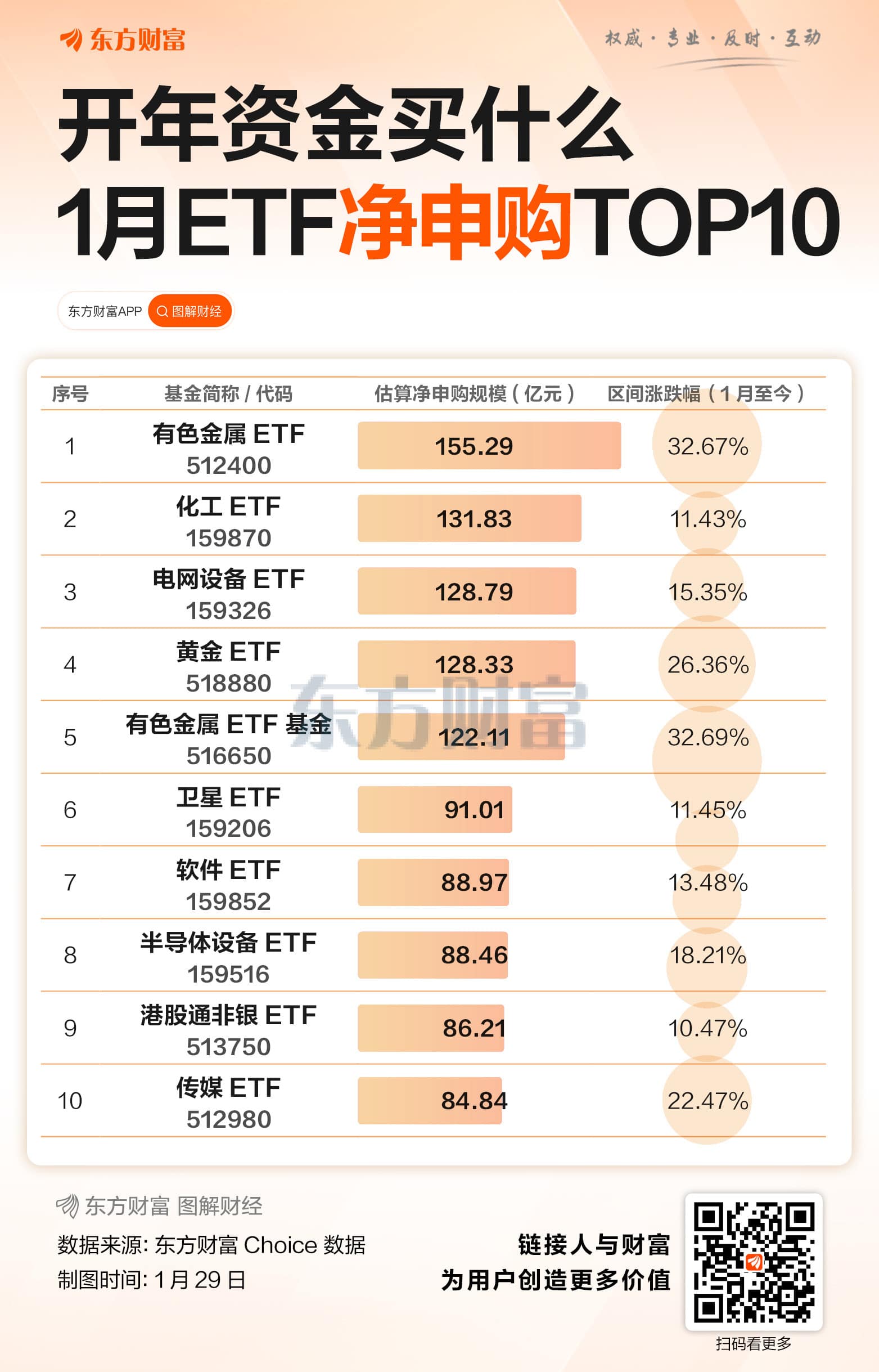 据东方财富Choice 数据,截至 1 月 29 日收盘,1 月净申购前十的 ETF 总计净流入资金超 1100 亿元,且其中有三只与有色、黄金有关,分别是有色金属 ETF、黄金 ETF 和有色金属 ETF 基金。同时,它们还是上榜 ETF 中区间涨幅的前三,其中黄金 ETF 从开年至今,区间涨跌幅 26.36%,其余两只有色 ETF 开年至今的区间涨幅则都在 32% 以上,可见超级周期的魅力。