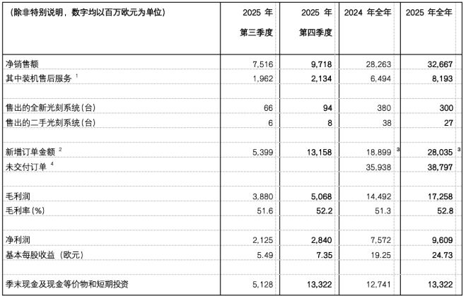 财报显示,2025 年第四季度,ASML 实现净销售额 97 亿欧元,毛利率为 52.2%,净利润达 28 亿欧元;第四季度的新增订单金额为 132 亿欧元,其中 74 亿欧元为 EUV 光刻机订单。