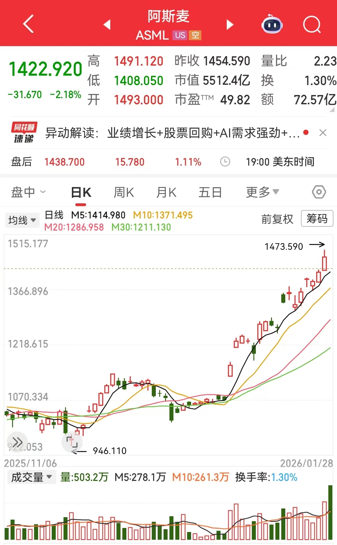截至当地时间 1 月 28 日收盘,阿斯麦报 1422.92 美元,跌幅 2.18%,市值 5512.4 亿美元。