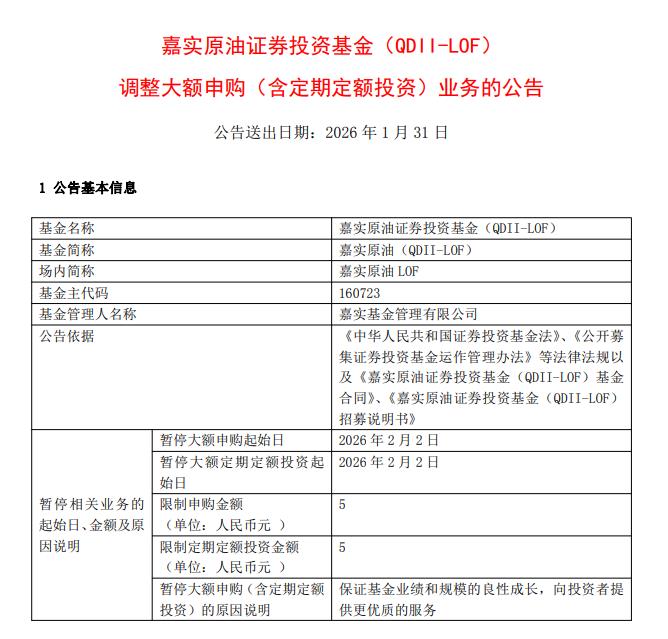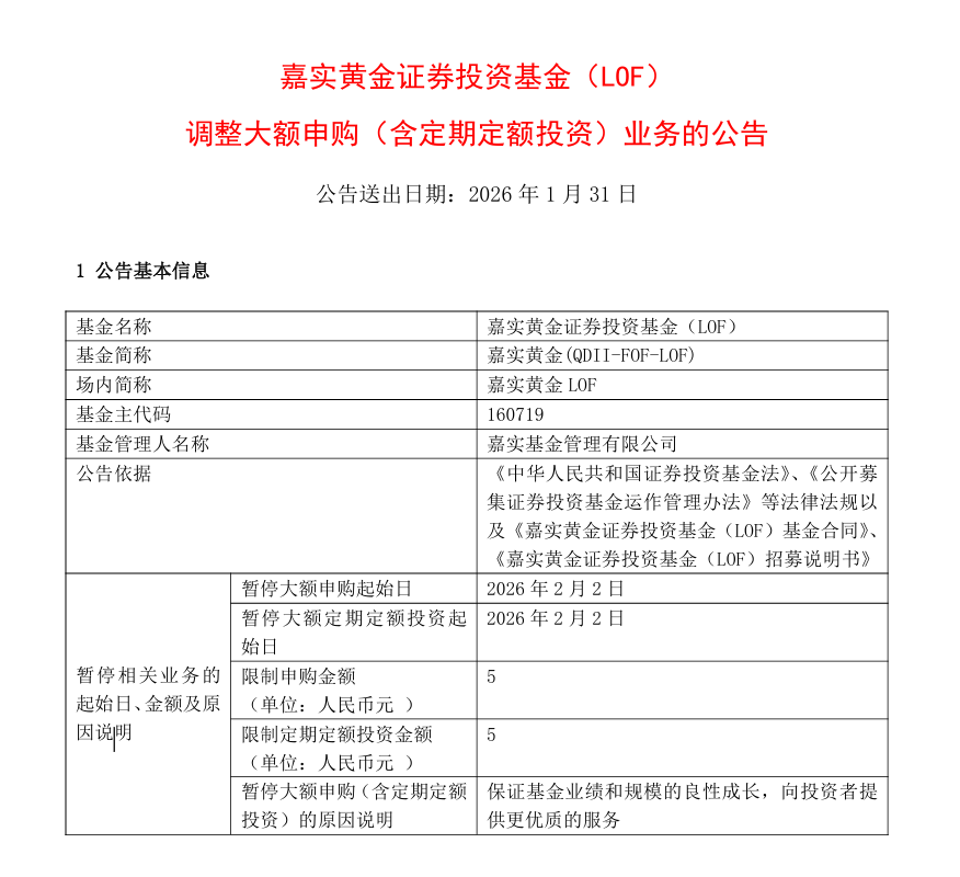 嘉实原油 LOF、嘉实黄金 LOF 公告,自 2026 年 2 月 2 日起暂停大额申购、大额定期定额投资业务,每日累计投资限额不超过 5 元。