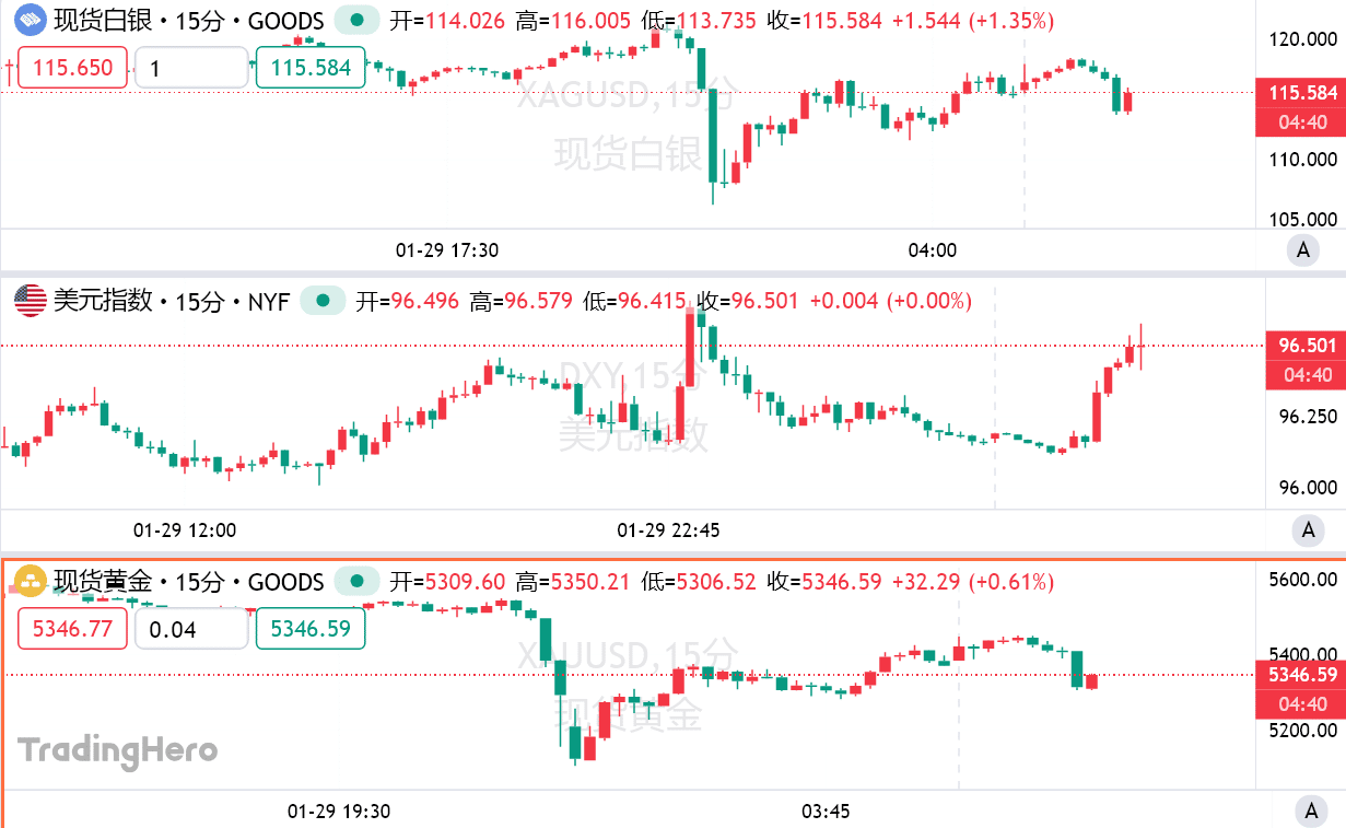 截至发稿,美元指数日内上涨 0.4%,报 96.56;现货黄金盘中快速回落,短线跌近 50 美元,最低至 5325.33 美元/盎司,截至发稿报 5348 美元/盎司,日内跌 0.4%;现货白银一度回落至 114 美元/盎司下方,截至发稿小幅转涨,报 115.73 美元/盎司。