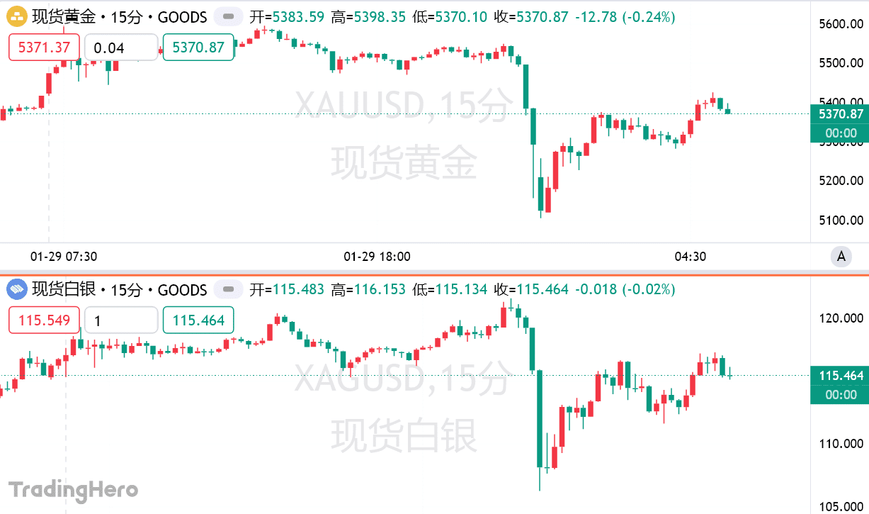 现货黄金在周四美盘末转涨,收复逾 300 美元的历史最大单日跌幅,最终收报 5370.87 美元/盎司,收跌 0.85%。现货黄金在整个周四交易时段中,于亚盘初创下了 5596.7 美元的历史新高,并在美盘中跌至 5105 美元,使单日振幅扩大至近 500 美元。