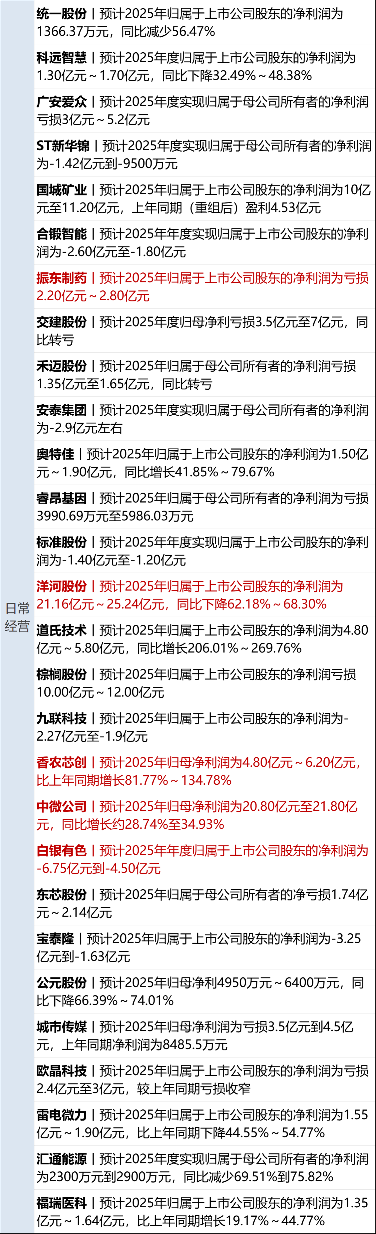 寒武纪 (SH688256,股价 1258.89 元,市值 5309 亿元):1 月 30 日晚,寒武纪发布 2025 年业绩预告,公司预计 2025 年营业收入为 60 亿元至 70 亿元,与上年同期相比增加 48.26 亿元到 58.26 亿元,同比增长 410.87% 至 496.02%;归母净利润为 18.5 亿元到 21.5 亿元,同比扭亏为盈;扣非后归母净利润为 16 亿元到 19 亿元。