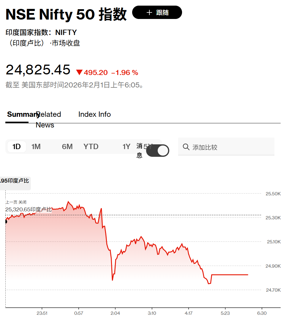2 月 1 日,印度股市全线大跌,NSE Nifty 50 指数下挫约 2%,创下自 2020 年以来 「预算日」 最大跌幅。