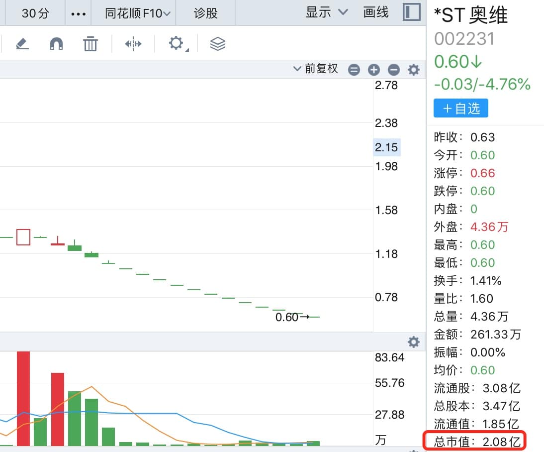 *ST 奥维(002231.SZ) 是 2026 年首家 「市值退市」 的公司。