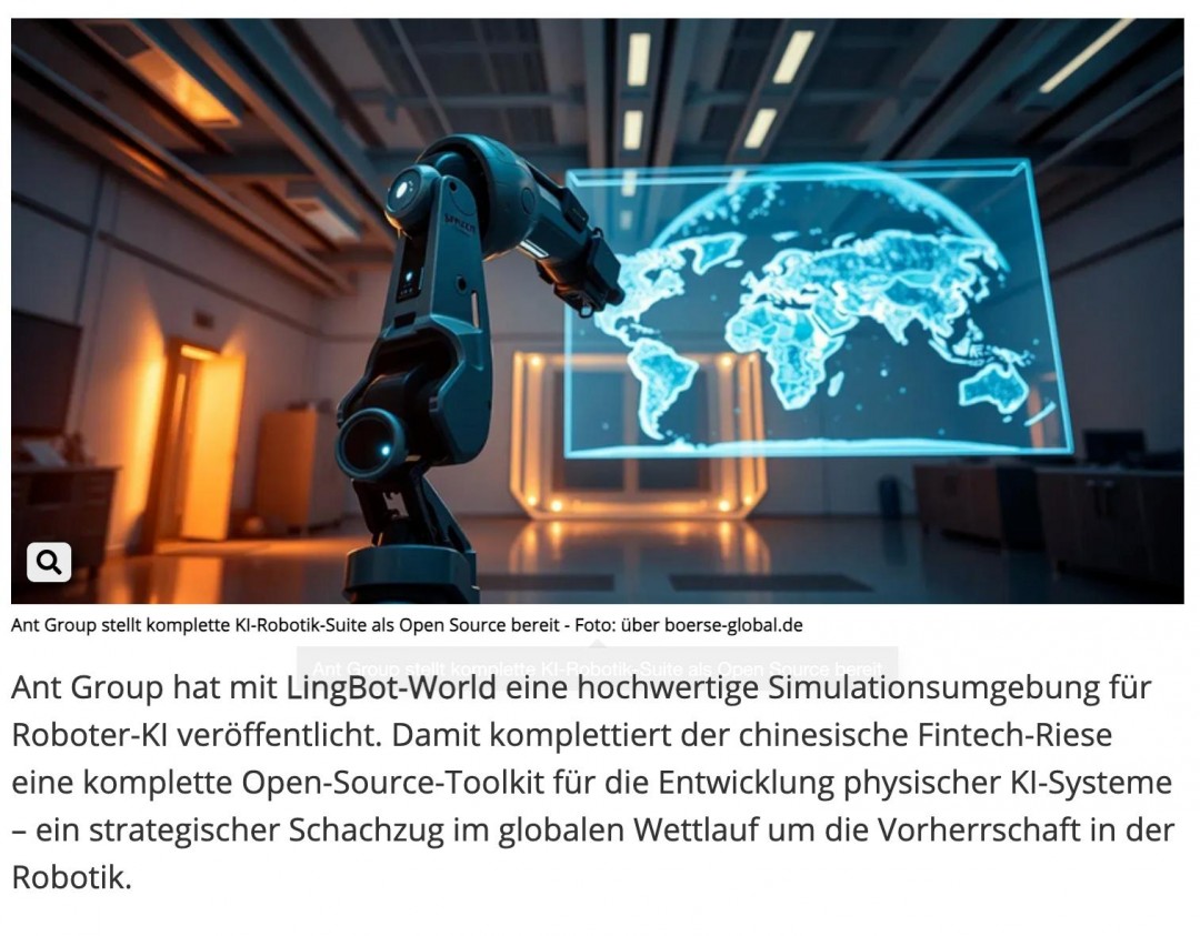 德国头部财经网站 AdHocNews 评价称,「蚂蚁集团发布了名为 LingBot-World 的高质量机器人 AI 模拟环境。这家中国科技公司完善了一套完整的开源工具包,用于物理 AI 系统的开发。这也是在全球机器人领域主导权争夺战中的一项战略性举措。」