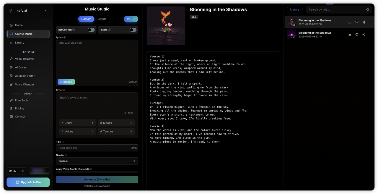 无论您是创作原创曲目、为视频创作背景音乐、尝试创意音效设计,还是使用自己的声音生成完整的歌曲,Nafy.ai 都能迅速提供高质量的结果。在该平台上生成的所有音乐都可用于商业用途,并且可以以高质量格式下载。