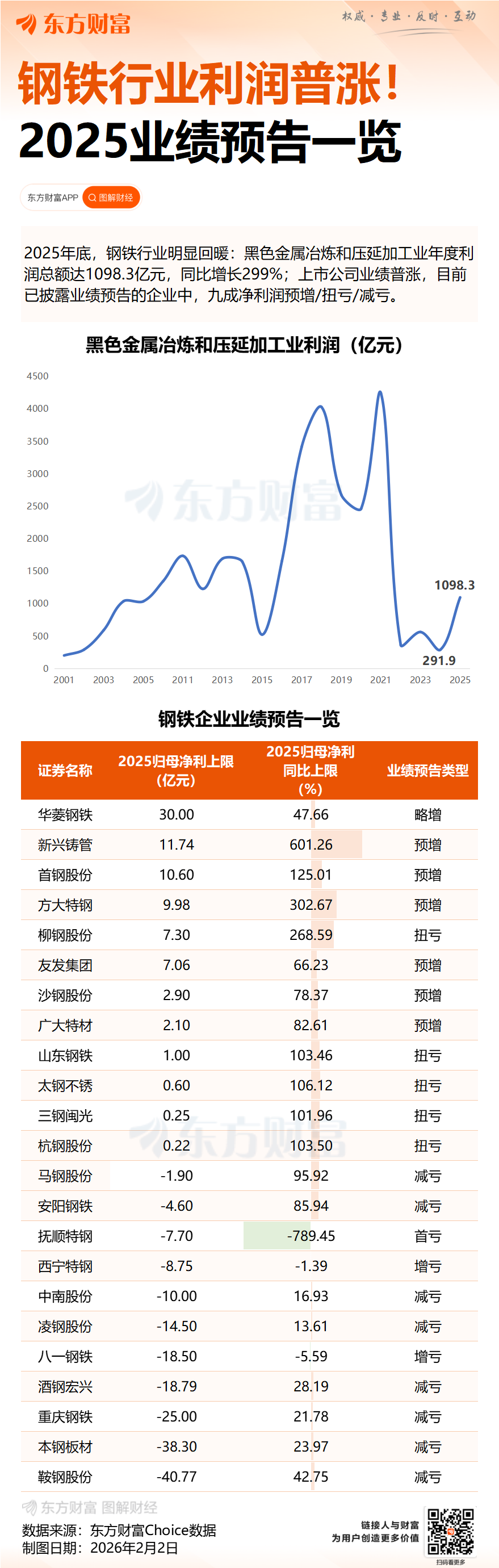 2025 年,中国钢铁行业上演了充满张力的 「冰与火之歌」。在需求连续第五年下滑、市场供强需弱的背景下,行业整体利润却迎来爆发式反弹。国家统计局数据显示,2025 年黑色金属冶炼和压延加工业实现利润总额 1098.3 亿元,同比增长高达 299.2%。然而,A 股上市钢企的悲欢并不相通。