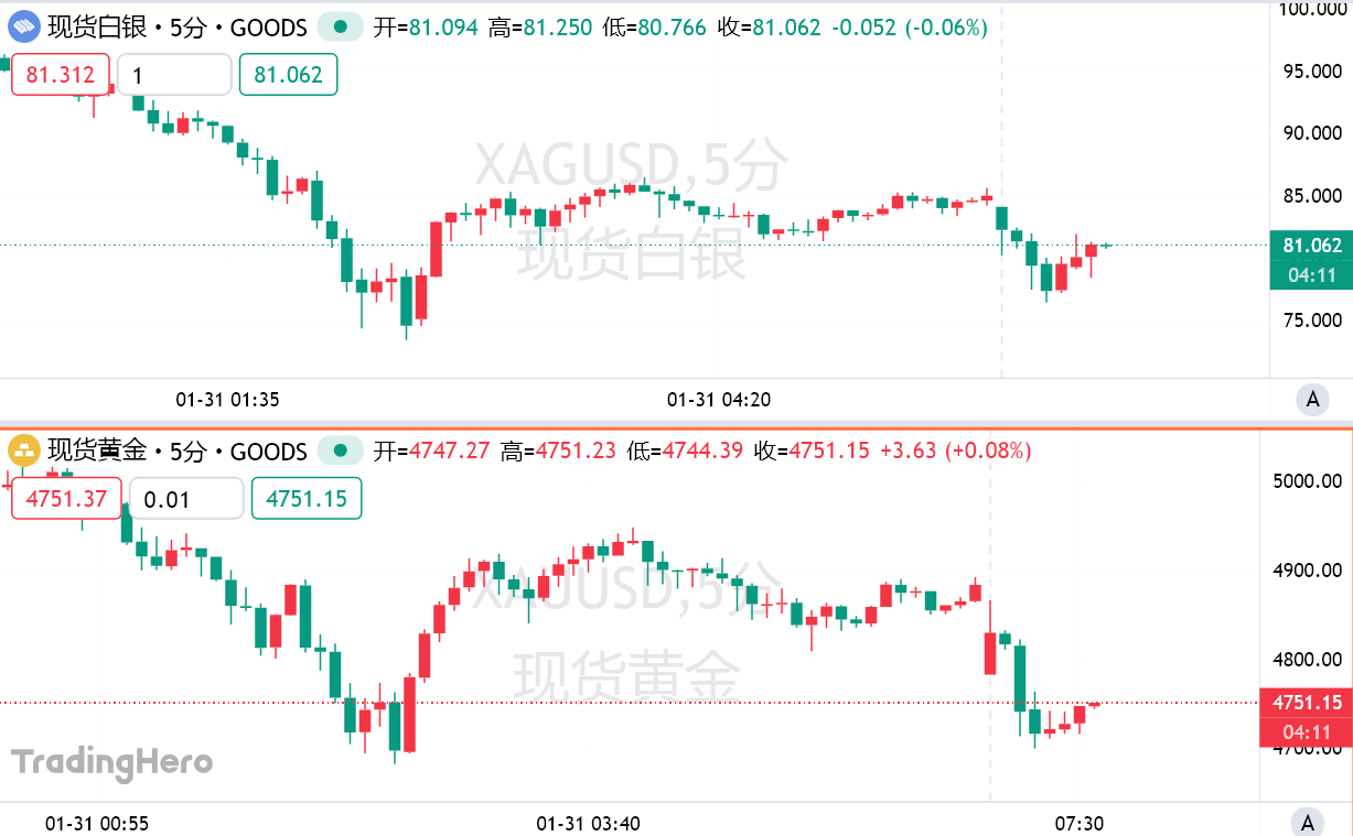 截至发稿,现货黄金报 4734.45 美元/盎司,跌幅 3.08%;现货白银报 80.93 美元/盎司,跌幅 4.7%。上周五,贵金属经历了史诗级暴跌行情。