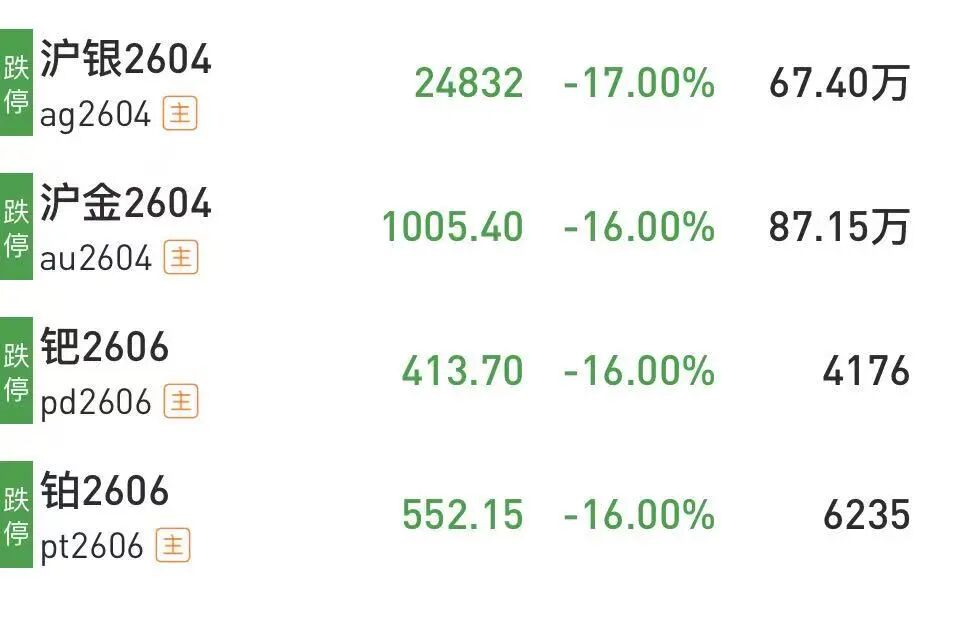 贵金属方面,白银、铂、钯期货主力合约早早封住跌停,沪银期货跌幅 17%,铂、钯期货跌幅 16%;黄金期货午后触及跌停,跌幅 16%。
