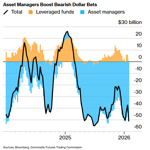 根据彭博汇编的美国商品期货交易委员会 (CFTC) 数据,在截至 1 月 27 日的一周内,基金经理的美元净空头头寸增加了 83 亿美元,创下自 2025 年 4 月以来的最大增幅。与此同时,对冲基金在同一时期将其美元净多头头寸削减了 51 亿美元,为 2024 年 7 月以来最大降幅。