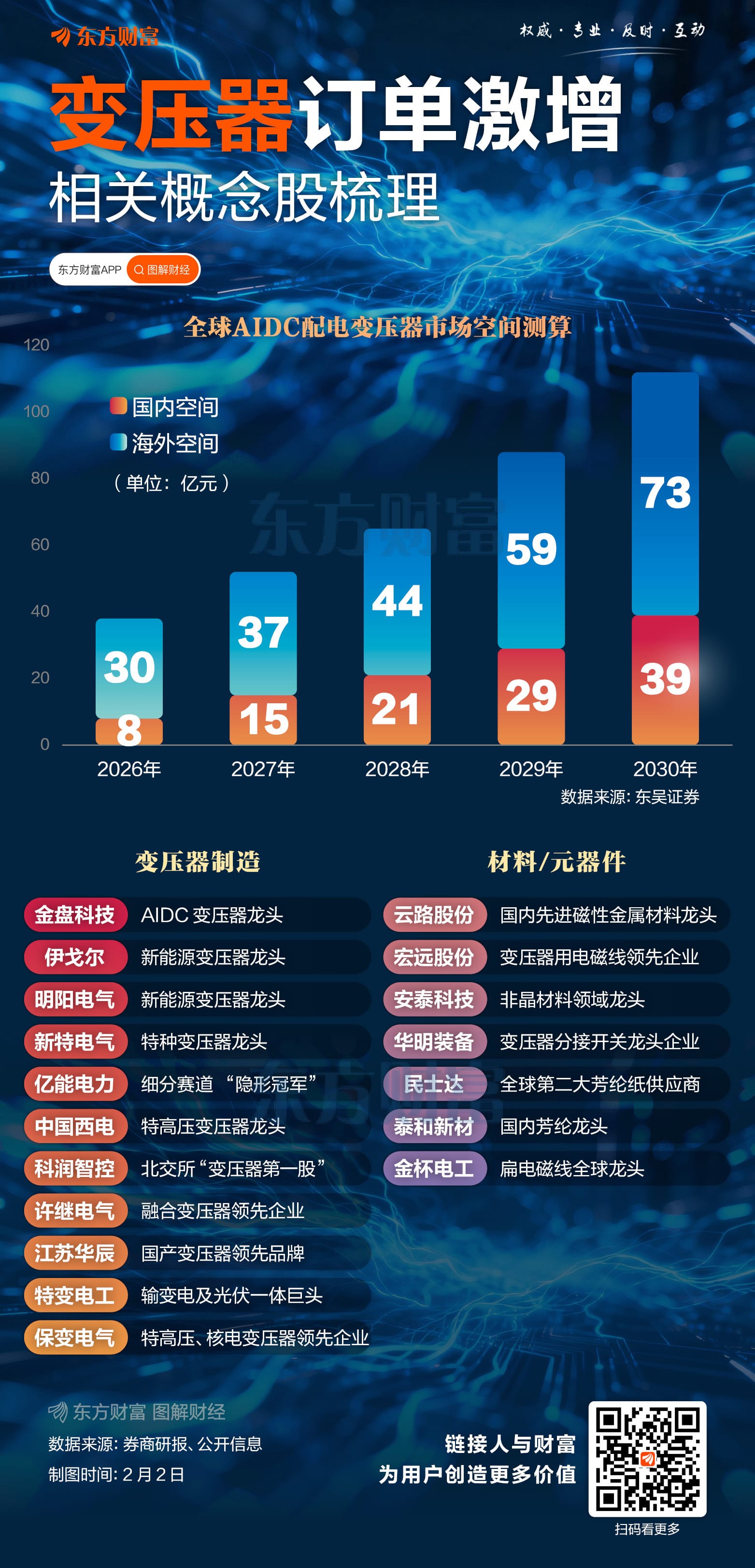 东吴证券表示,AIDC 的爆发式增长,也为变压器带来新的增长极。经测算,2030 年全球 AIDC 配电变压器市场空间将达 112 亿元,2024-2030 年 CAGR 达 39%。其中海外市场 2030 年达 73 亿元,出海空间广阔。