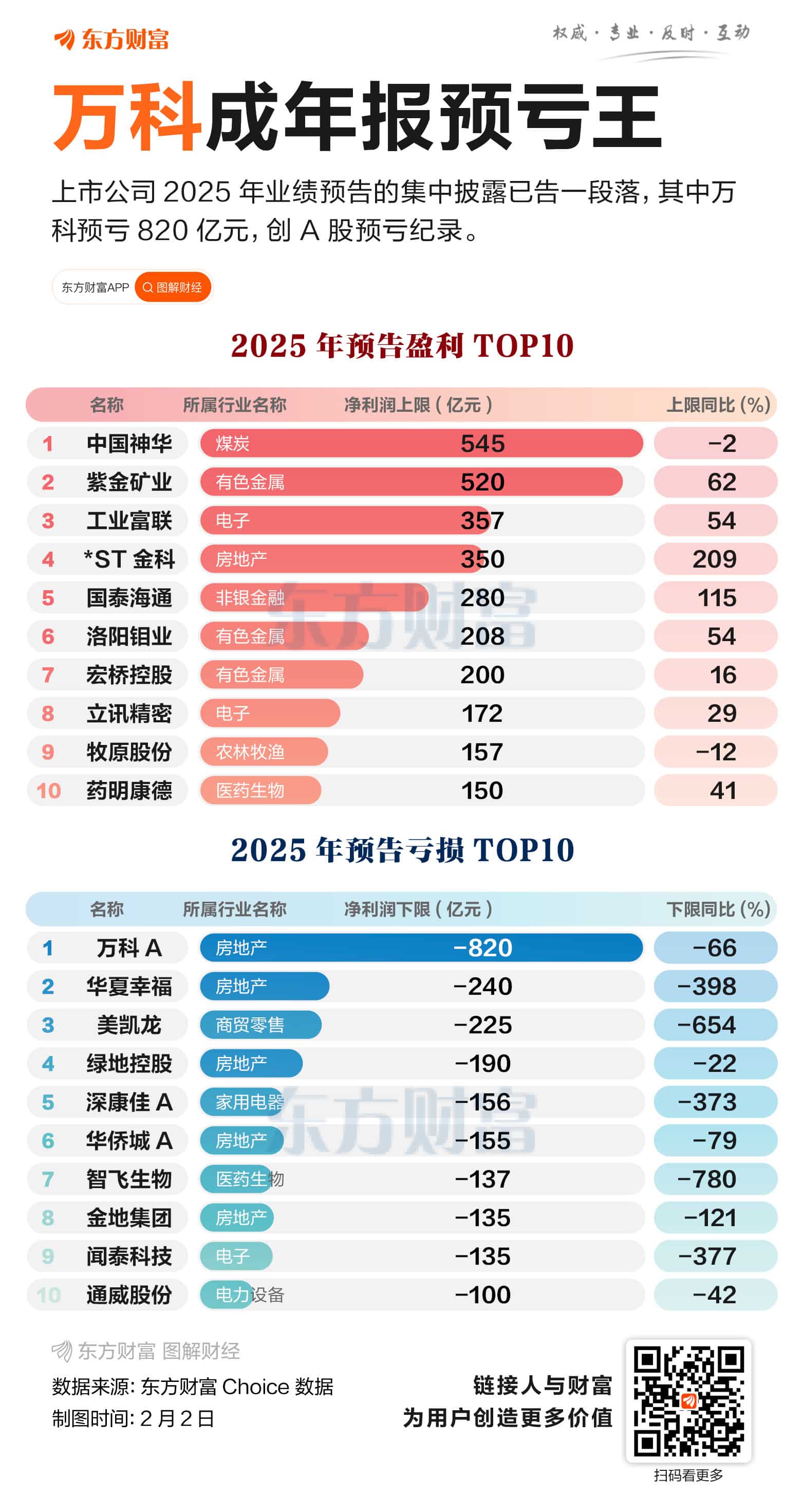 预亏居前的公司多为房地产行业的龙头企业,其中万科 A等房地产公司亏损最为严重。业绩预告显示,2025 年万科归母净利润预亏约 820 亿元。以此计算,2025 年万科每天预计亏损约 2.25 亿元。万科如此亏损规模已经超越了海航控股(2020 年亏损 640 亿元),或将刷新 A 股单年亏损的金额纪录。除了万科外,华夏幸福、绿地控股、华侨城 A和金地集团预亏金额也位居前列,均超 130 亿元。