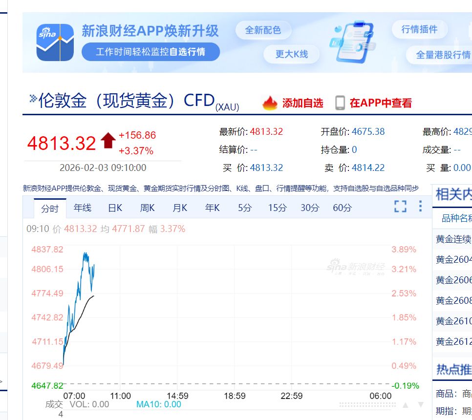 2 月 3 日亚市早盘,黄金白银强劲反攻。截至发稿,现货黄金突破 4813 美元/盎司,日内一度涨超 3%;