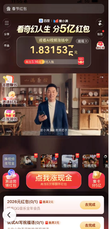 百度红包的三种核心玩法包括:看视频领钱、前 1000 名集齐稀有卡得万元,以及通过文心助手猜口令。截至 2 月 1 日,已有近 5000 万人次使用 AI 功能抢红包,其中拍照搜万物和 AIGC 视频创作最受欢迎。