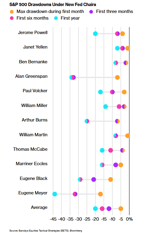 根据巴克莱汇编的数据,自 1930 年以来,在新任美联储主席走马上任后,标普 500 指数在一个月、三个月和六个月期间的平均回撤幅度分别达到 5%、12% 和 16%。这些跌幅超过了该指数在任意随机选取的年份中的典型峰值至谷底的回调幅度。