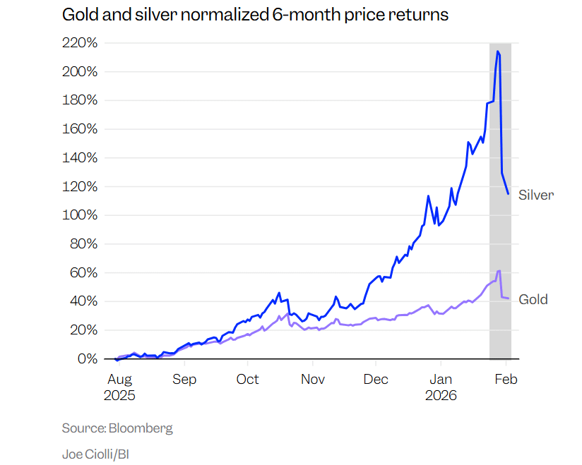 在沃什的提名促使市场重新评估所谓的 「货币贬值交易」 后,黄金和白银应声下挫。这一交易是过去 12 个月推动黄金创下历史新高的主要力量。