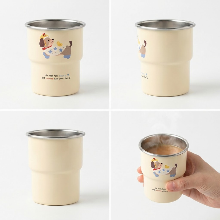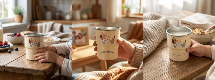 在原图的基础上,保留杯子主体,日系清新风,中景聚焦温馨居家桌面。木质桌面上,米白色针织餐垫摆放杯子,旁有复古胶片相机、白色花瓶 (插尤加利叶)、米色信封,背景是米色纱帘。暖色调,木棕、米白、灰绿为主,质感治愈精致,光影柔和明亮;营造日系居家静物摄影氛围。
