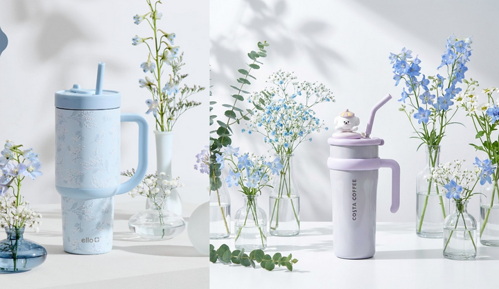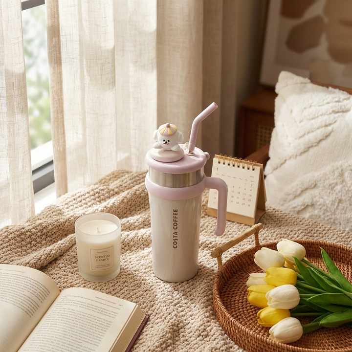在原图的基础上,保留杯子主体,将背景换成日系小清新风格和 ins 好物分享风格,采用柔和的自然光 (模拟大窗户日式亚麻纱帘侧光),构图采用经典小红书 45 度俯拍视角或平视特写。米棕色针织毛毯上,错落摆放磨砂玻璃香薰蜡烛,书籍、木质日历、编织托盘盛着白色与米黄色郁金香,旁有白色抱枕。暖色调,以米棕、奶油白为主,质感细腻,充满生活仪式感,背景柔和弱化,突出主体物品层次与细节,文字元素清晰自然,让画面丰富一些,具备生活感气息,但也不能杂乱,高光柔和,阴影干净有空气感。不要生硬得像广告片,风格:高级、精致生活、真实分享感。