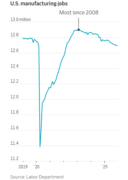 联邦数据显示,在特朗普宣布实施 「解放日」 关税后的八个月里,制造业就业岗位逐月减少,延续了自 2023 年以来超过 20 万个岗位消失的萎缩趋势。美国供应管理协会追踪的工厂活动指数截至去年 12 月已连续 26 个月处于萎缩区间,尽管今年 1 月的新订单和生产指数意外回升,令分析师感到惊讶。美国人口普查局估计,在拜登时代芯片和可再生能源资金推动下曾大幅增长的制造业建设支出,在特朗普上任后的头九个月里逐月下降。