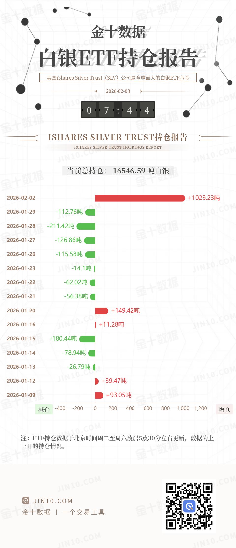 本周一,iShares Silver Trust 延续跌势,收盘下跌 4%。不过,投资者依然没有退缩,周二数据显示,iShares Silver Trust 持仓较上个交易日增加 1023.23 吨,为其历史第三大单日增幅纪录,当前持仓量为 16546.59 吨。