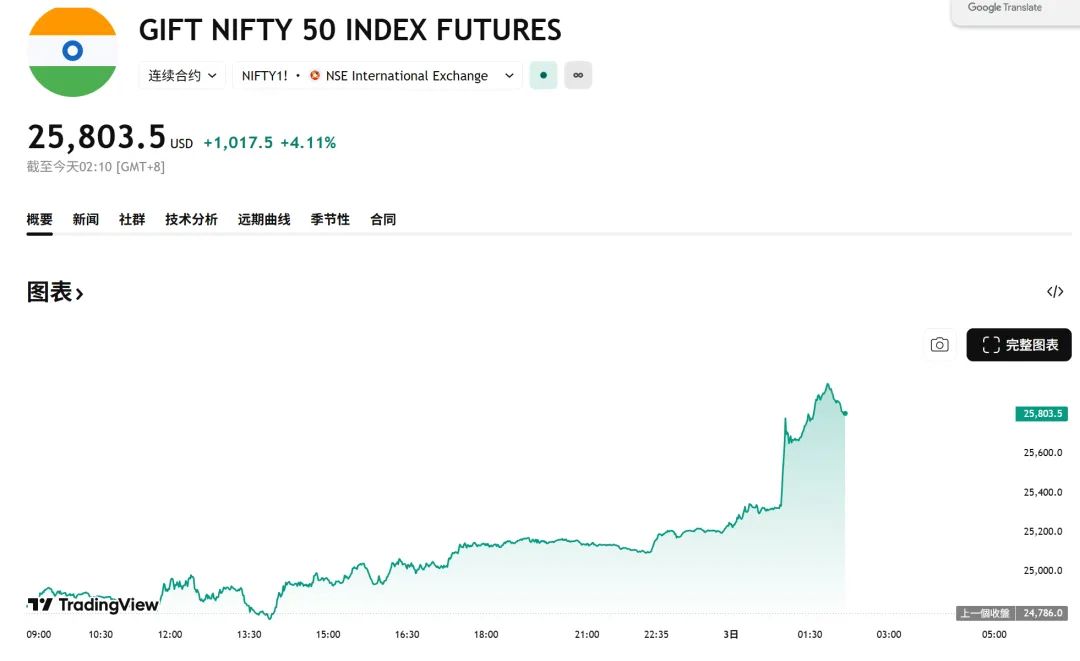 受消息影响,印度基准股指 Nifty 50 的股指期货一度飙升;在美国上市的 iShares MSCI India ETF 涨近 3%。离岸市场中,印度卢比对美元走强,上涨 1%。