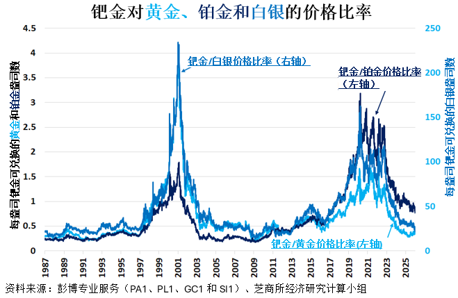图 7:钯金相对于黄金和白银同样处于历史低位