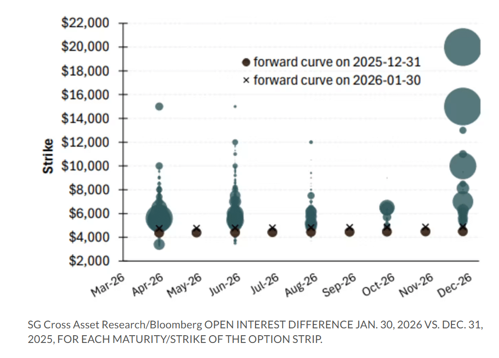 根据法兴银行分析师的观察,虽然行权价在 4000 美元的看跌期权也有所增加,但极端押注明显较少。这种非对称的风险偏好特征既是衡量情绪的有用指标,也是看涨的信号。尽管如此,他们承认通常无法推断期权头寸是属于投机还是套期保值,且每一笔期权买单的背后都对应着一个卖家。