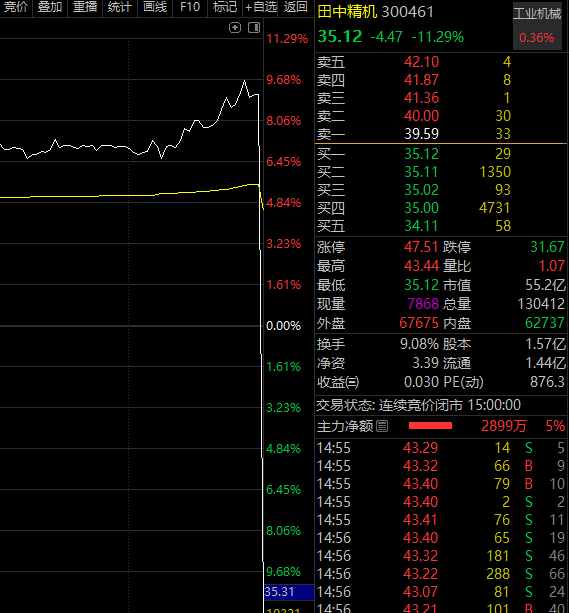 来源: 数据宝 田中精机(300461)尾盘惊现大跳水,竞价交易最后阶段价格为43.19元,涨幅超9%,集合竞价暴跌至35.12元,跌幅超11%。也就是说,从竞价交易到集合竞价该股累计暴跌近19%。(数据宝) 文章转载自东方财富