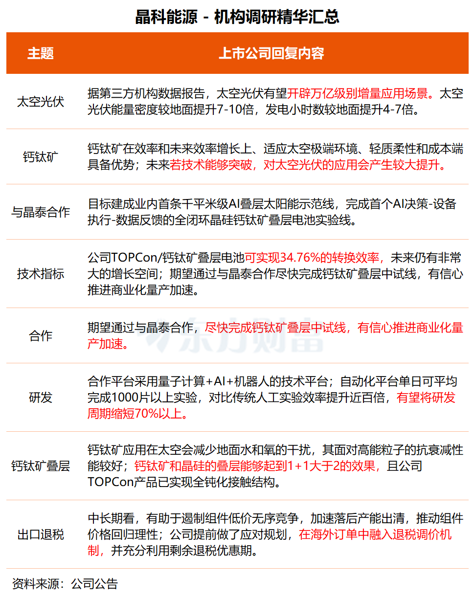「据相关第三方机构数据报告, 太空光伏有望开辟一个万亿级别增量应用场景。」 晶科能源在调研中透露,当前公司 TOPCon/钙钛矿叠层电池可实现 34.76% 的转化效率,未来仍有非常大的增长空间。公司期望通过与晶泰合作,尽快完成钙钛矿叠层中试线,有信心推进商业化量产加速。