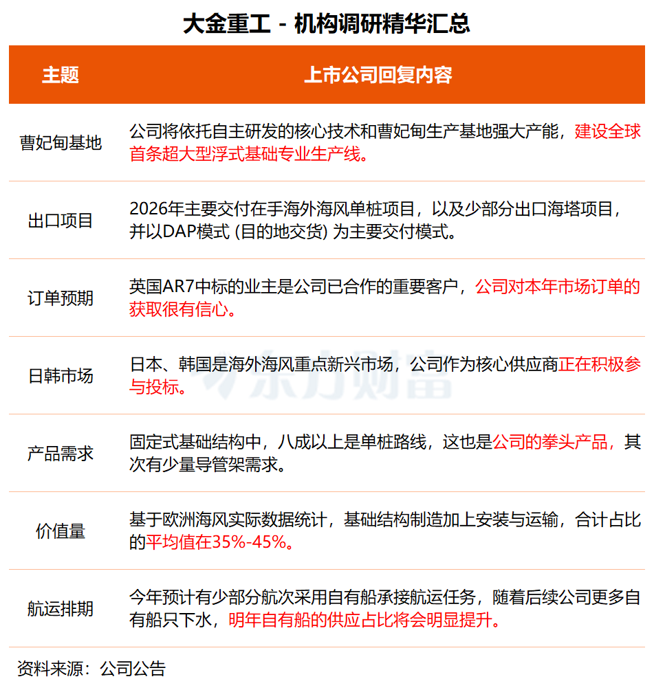 「2026 年主要交付在手海外海风单桩项目,以及少部分出口海塔项目,并以 DAP 模式为主要交付模式。」 大金重工表示,日本、韩国是海外海风重点新兴市场,公司作为核心供应商正在积极参与投标。