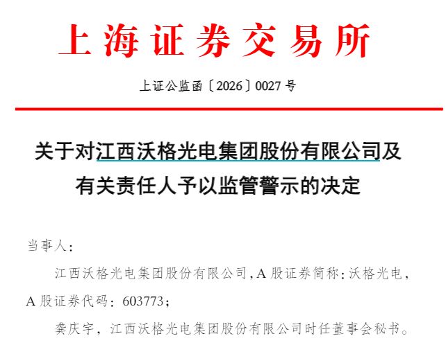 根据 《股票上市规则》 等有关规定,上交所决定对沃格光电及董秘龚庆宇予以监管警示。此外,《决定书》 还要求沃格光电在收到决定书后的 1 个月内,向上交所提交经全体董事、高级管理人员签字确认的整改报告。