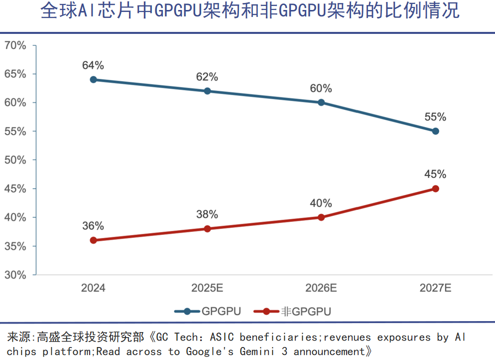 谷歌在 Gemini3 大模型就采用自研的 TPU 训练完成,打破了英伟达的垄断,而亚马逊、META 和微软等均在自研非 GPGPU 架构芯片。高盛就预计未来非 GPGPU 的占比将逐步抬升,这也是当前英伟达股价承压的一大原因。