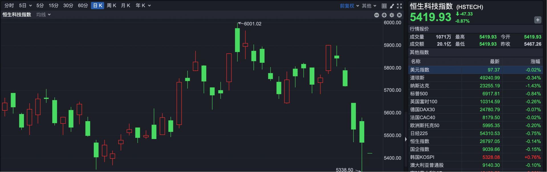 恒生科技指数开盘报 5419.93 点,下跌 47.33 点,跌幅 0.87%。