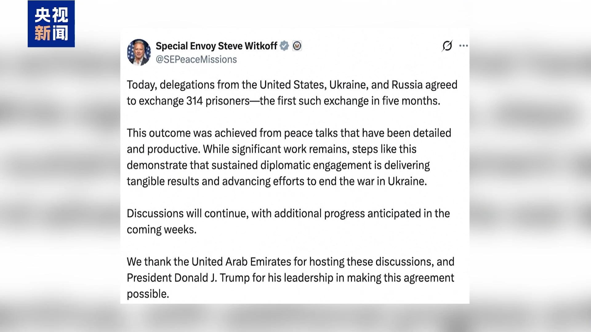 美国总统特使威特科夫 5 日在社交媒体上发文说,美国、乌克兰和俄罗斯三方代表当天达成协议,俄乌同意交换 314 名被扣押人员。各方将继续开展对话,预计今后数周将取得更多进展。