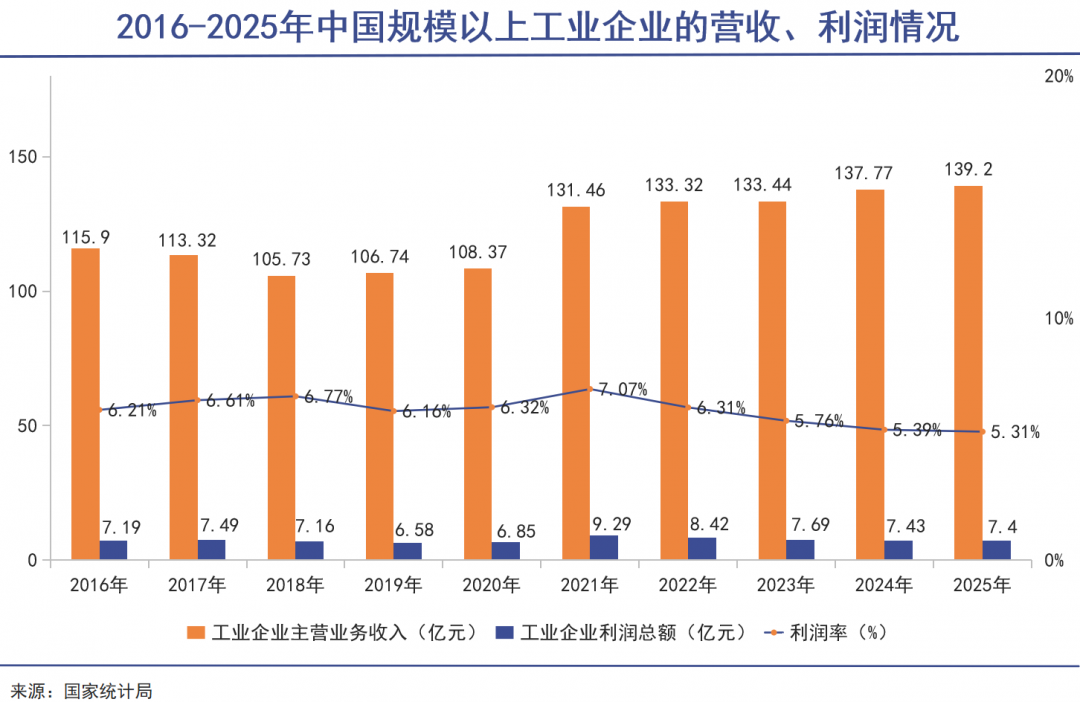 更值得注意的是,在所有工业企业中,制造业更是那个 「拉低赚钱能力」 的更短的短板。2025 年,虽然制造业工业企业实现利润总额 56915.7 亿元,同比增长 5.0%,但利润率仅为 4.7%。