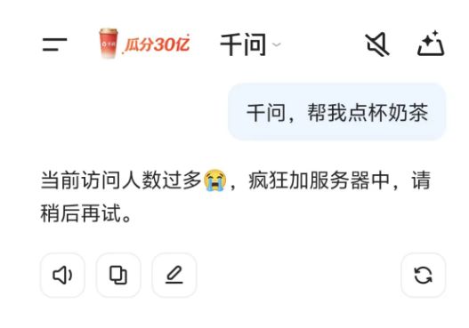 活动上线后,不少网友反馈,千问明显出现卡顿,「千问请客」 页面无法点击,页面信息显示 「系统开小差了,稍后再试吧」。