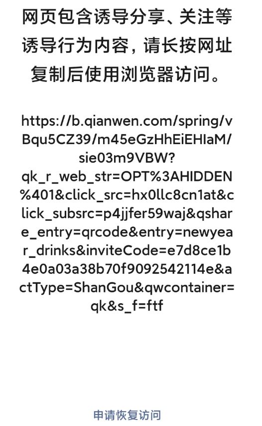 值得注意的是,继微信封杀自家腾讯元宝、百度文心助手后,千问的红包分享链接也被微信屏蔽,页面显示网页存在诱导或误导下载/跳转的内容,需要跳转第三方浏览器访问。同时,部分用户在千问 APP 点击分享活动至微信好友时,已自动改为复制口令形式。