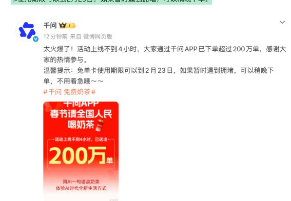 另据千问最新回应:活动上线不到 4 小时,大家通过千问 APP 已下单超过 200 万单;免单卡使用期限可以到 2 月 23 日,如果暂时遇到拥堵,可以稍晚下单。