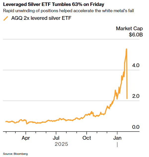 根据彭博汇总的数据,白银价格在 1 月 30 日的突然暴跌,因规模最大的此类杠杆 ETF——旨在获得两倍于白银期货日回报的 ProShares Ultra Silver ETF(代码 AGQ)——抛售了价值数十亿美元的白银而被加速。随着白银遭遇有记录以来最大的盘中跌幅,AGQ 由于其每日杠杆重置机制,不得不机械性地削减期货头寸,从而向本已拥挤的市场释放出一波抛售潮。根据其网站上的招募说明书,AGQ 必须在美东时间下午 1:25 根据资产净值进行再平衡。