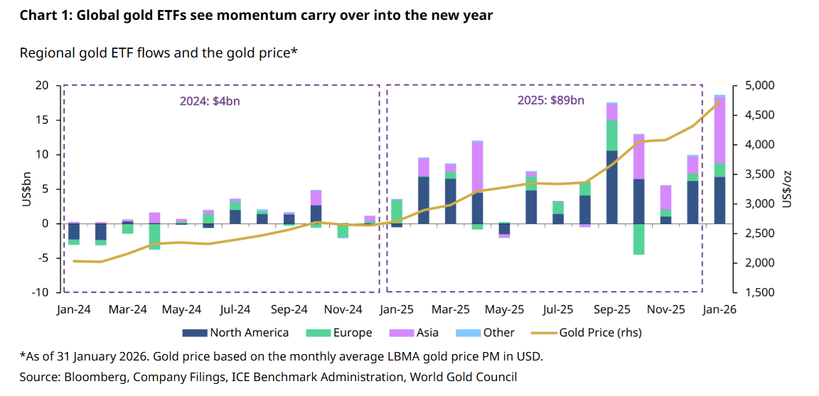 亚洲黄金 ETF1 月净流入高达 100 亿美元,远高于 2025 年月均水平,为连续第五个月净流入,创下该地区历史最高月度纪录。
