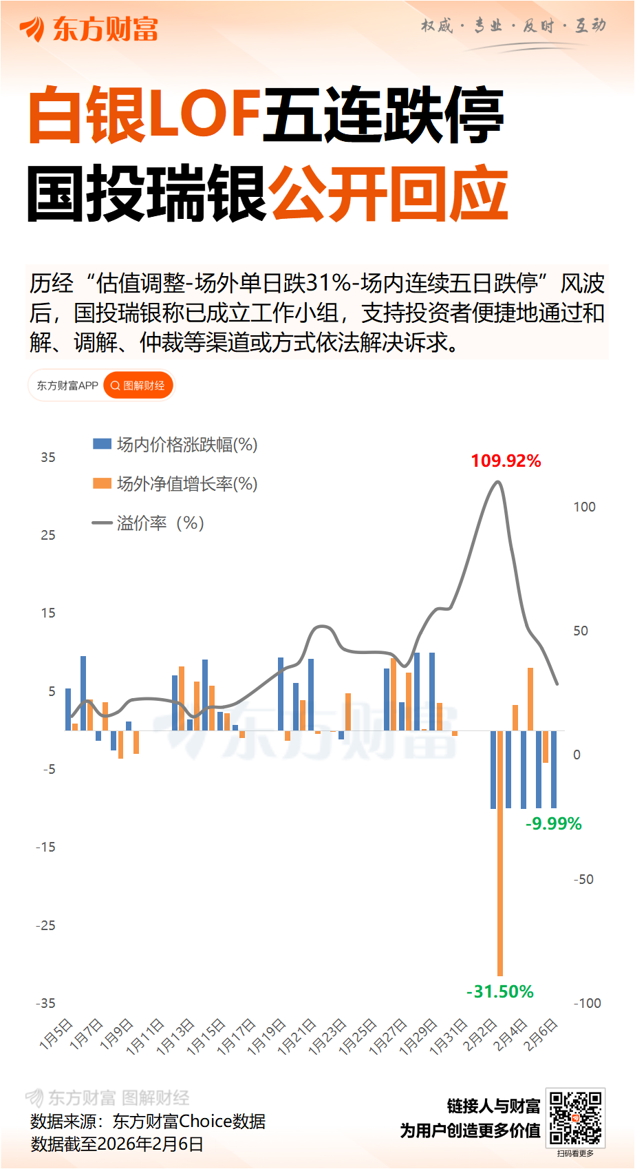 国投白银 LOF 近期进行估值调整和相关公告引发投资者高度关注,今日国投瑞银基金公告称,践行以投资者为本。公司将秉持依法公开原则,积极回应投资者诉求,努力降低相关估值调整对投资者的影响,保护投资者合法权益。公司已成立工作小组,正在抓紧研究制定相关工作方案,支持投资者便捷地通过和解、调解、仲裁等渠道或方式依法解决诉求,具体情况将另行公告。此外,公司将积极支持和解、调解、仲裁的有效执行,也有能力保障投资者的合法权益,并将在基金运作、估值等环节坚持公允定价,公平保护全体投资者的合法权益。