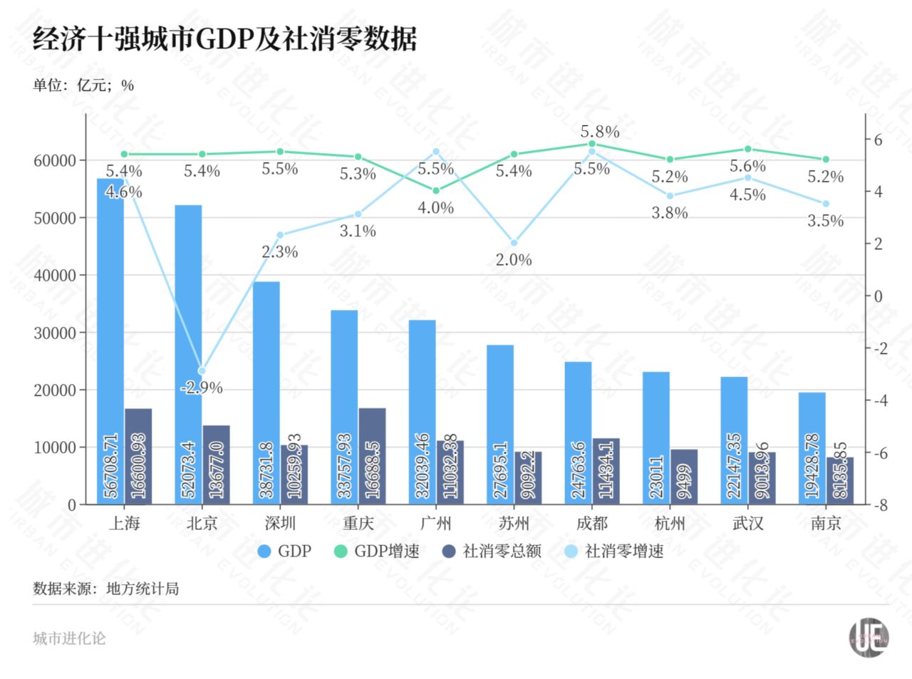 上述十强城市中,北京首次跨上五万亿台阶,成为继上海之后全国第 2 个五万亿元城市;深圳 GDP 总量达 3.87 万亿元,有望成为下一个四万亿元城市;成都则是以 5.8% 的经济增速在十强城市中实现 「领跑」。