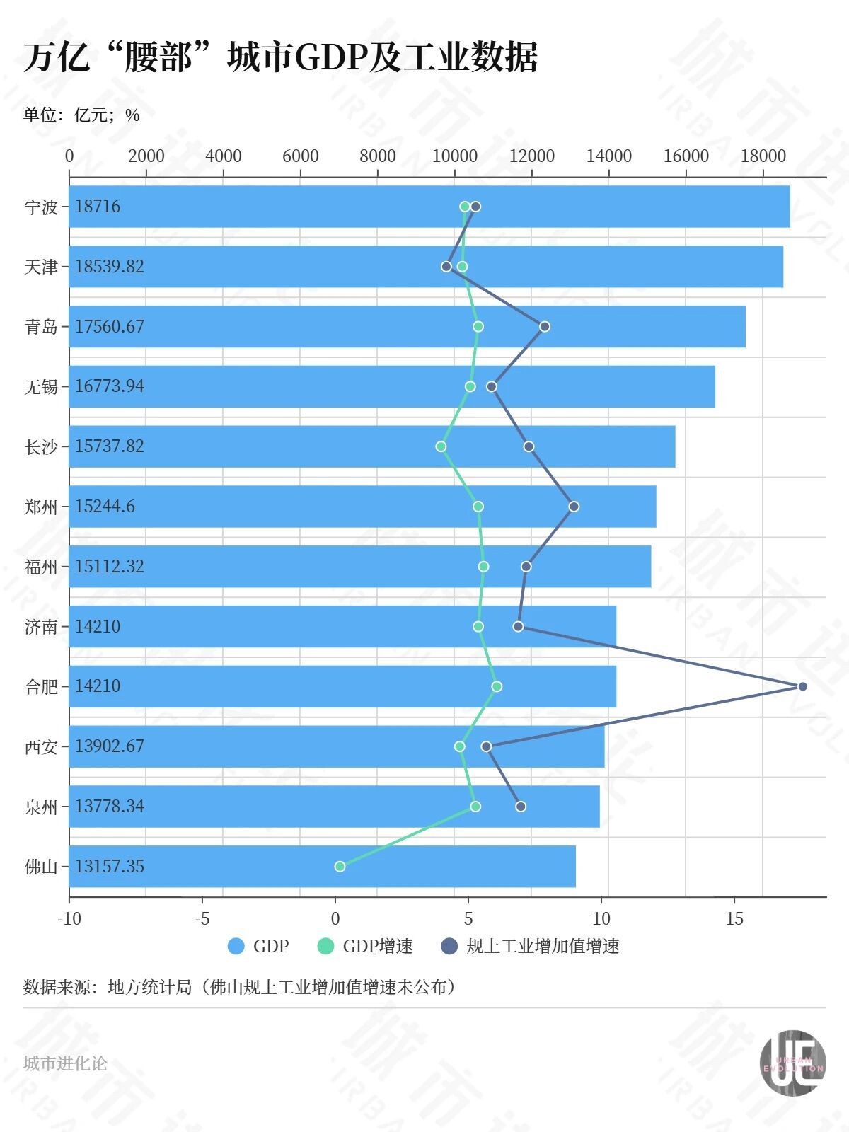 经济体量位于 1.3 万亿元至 1.8 万亿元的 「腰部」 城市之间竞逐更为激烈,合肥 GDP 增速 6.1%,追平济南,经济位次较上年提升一位至第 18 位,取得历史最好成绩;佛山 GDP 增速 0.2%,当前位列第 22 位,被西安和泉州超过。