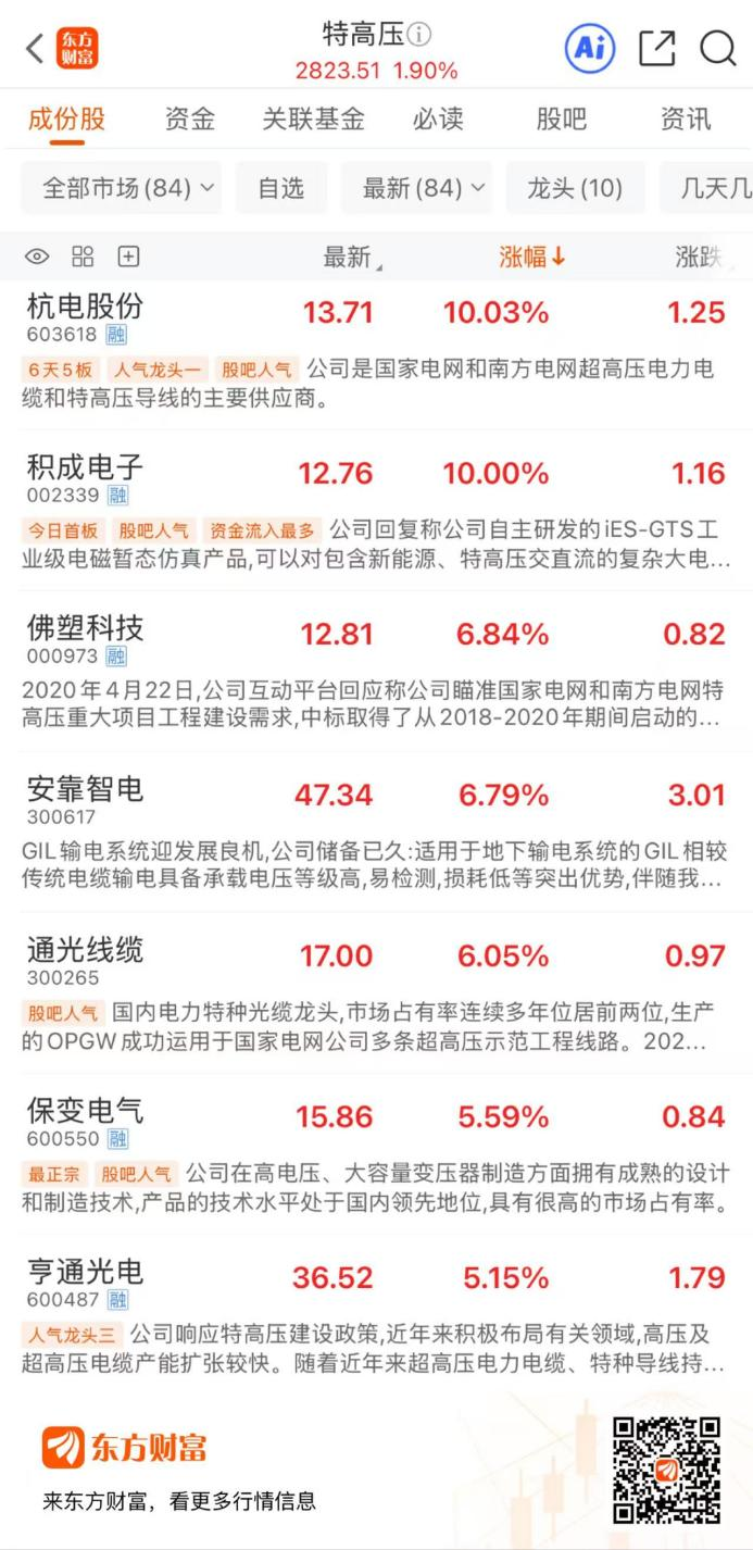 A 股特高压概念继续活跃。2 月 6 日,特高压概念低开高走,截至早间收盘,板块上涨 1.90%,涨幅居市场前列。个股方面,杭电股份、积成电子涨停,佛塑科技、安靠智电、通光线缆涨超 6%,保变电气、亨通光电涨超 5%,中天科技、汇金通、汇源通信、中辰股份、汉缆股份、东方铁塔等涨超 4%。