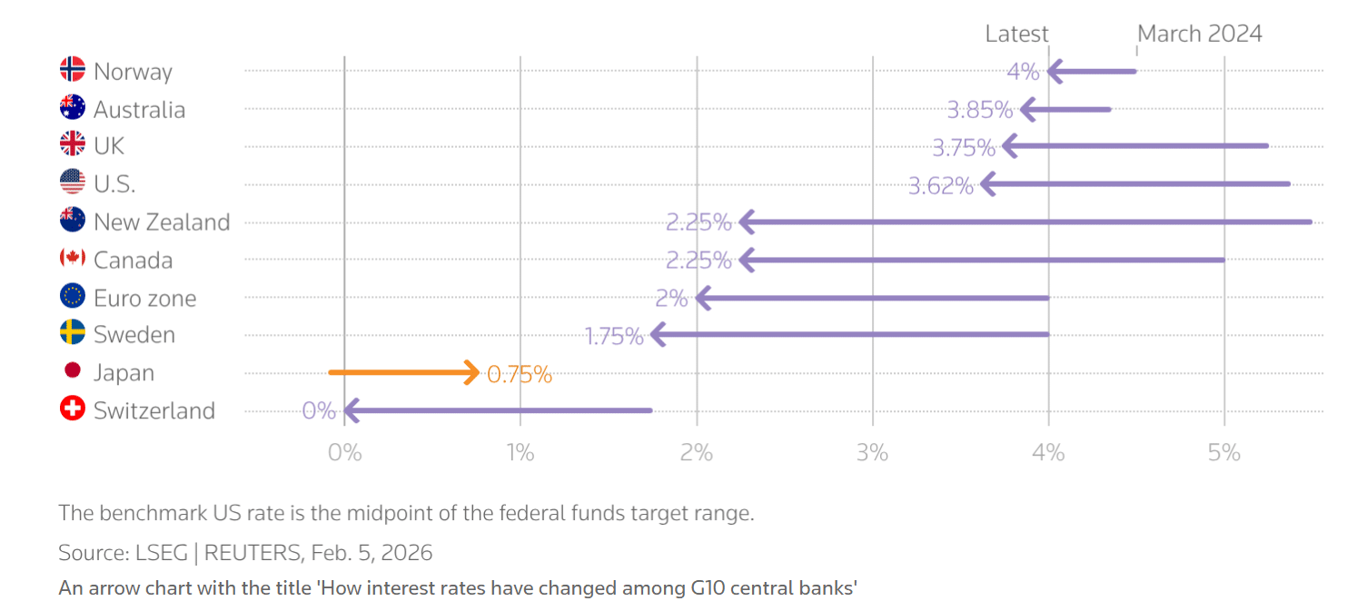 日本央行在去年 12 月将利率提高至 30 年来最高水平,随后在 1 月维持利率稳定。然而,首相高市早苗的鸽派倾向可能会使日本央行的路径复杂化,尤其是如果她在周日的提前选举中获得强势授权。
