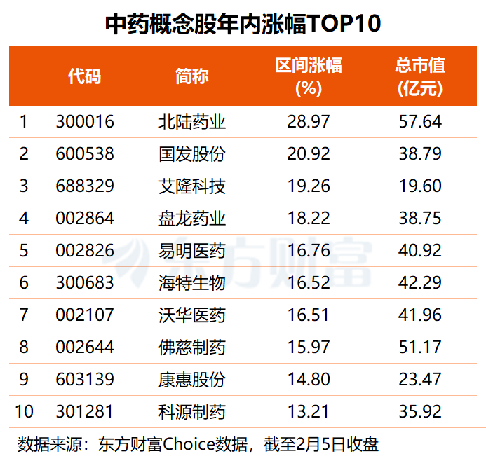 东方财富 Choice 数据显示,共计 60 只中药概念股披露 2025 年度业绩预告,其中,北陆药业、特一药业、一心堂等 13 股净利预增;步长制药、以岭药业、众生药业等 6 股成功扭亏;生物谷、振东制药、亚泰集团等 12 股业绩有所好转。